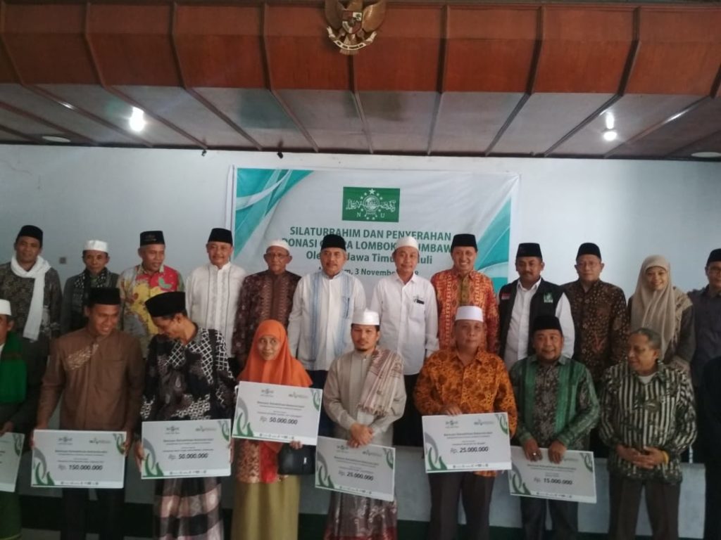 Bantuan diserahkan oleh Ketua NU Jawa Timur, Marzuki Mustamar kepada Posko NU Peduli Lombok, Sabtu (3/11) di Mataram.