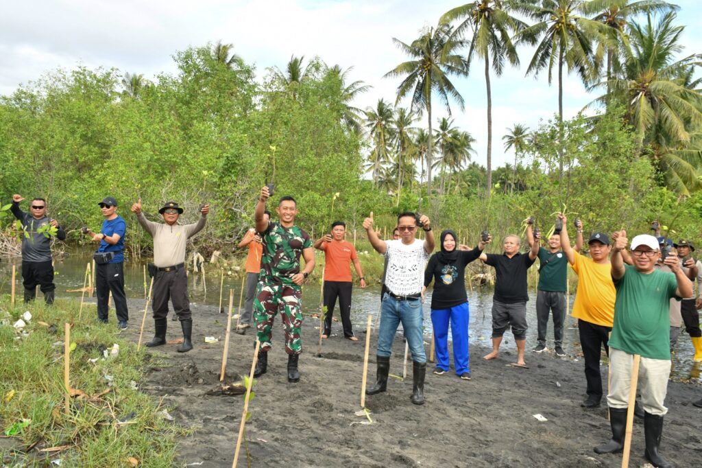 LOTIM LOMBOKita – Penjabat Bupati Lombok Timur Nusa HM Juaini Taofik, Dandim 1615 Lotim Letkol Inf Bayu Sigit bersama pecinta lingkungan, mahasiswa dan komonitas lainnya melakukan penanaman 1000 pohon bakau di pantai Labuhan Haji Lombok Timur, Jumat (7/6).