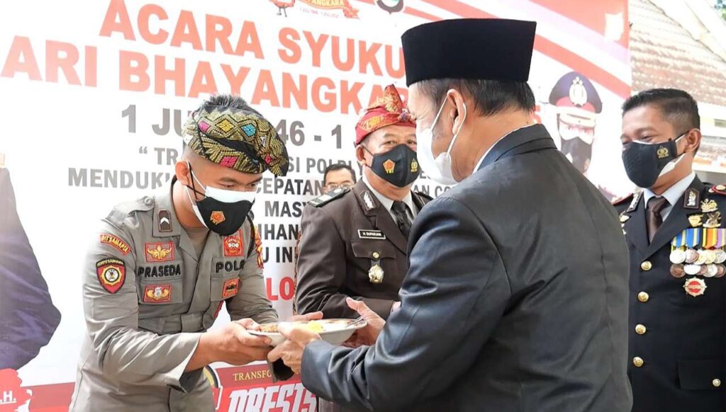 AKP Suparjan dan Bripda Iqbal mendapatkan nasi tumpeng perayaan HUT Bhayangkara ke-75 di Polres Lombok Tengah yang diberikan oleh Ketua DPRD, M. Tauhid.
