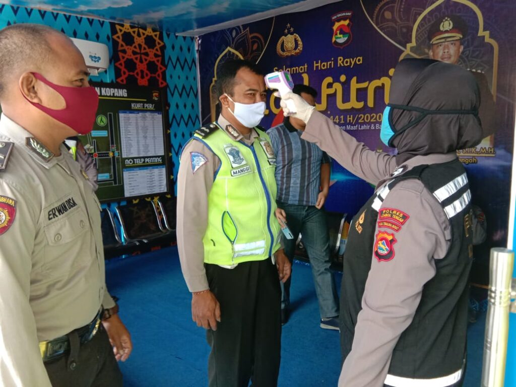 Ps. Paur Kesehatan Polres Lombok Tengah Bripka Rosi melaksanakan pemeriksaan suhu badan setiap personil, khususnya personil yang yang terlibat Ops Ketupat Gatarin 2020 di Pospam Praya dan Pospam Kopang, Senin (18/5/2020).