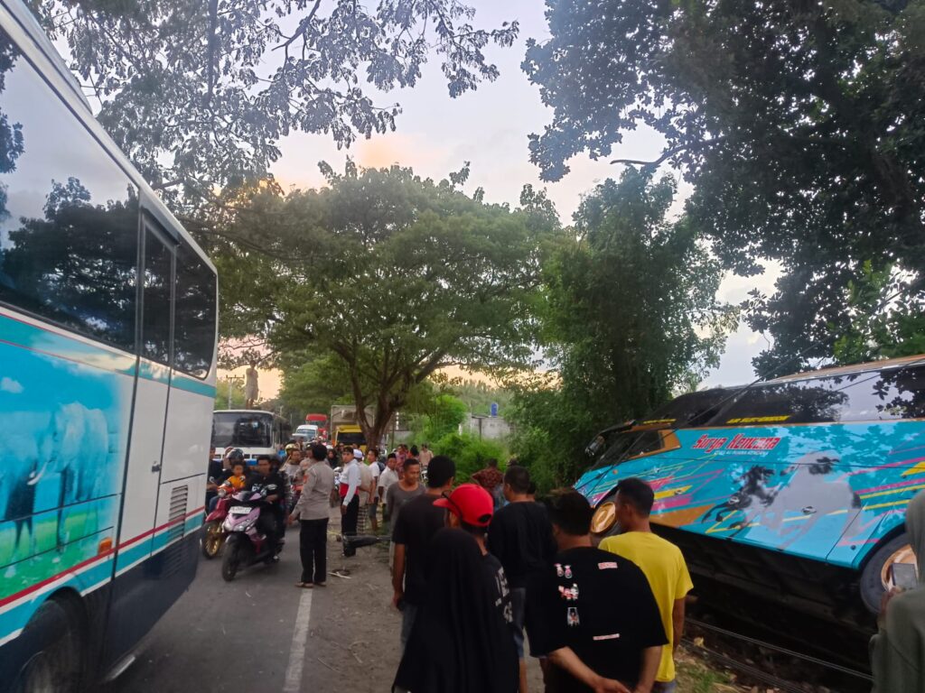 sopir bus langsung banting stir dan menabrak pohon kelapa yang ada dipinggir jalan, akibat menabrak pohon ini bus sempat terguling, dalam kejadian ini tidak ada korban jiwa, hanya mengalami luka luka, korban yang alami luka langsung di larikan ke puskesmas terdekat, dan kasusnya telah ditangani pihak kepolisian.