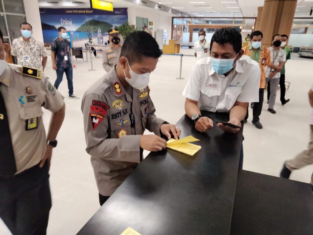 LOMBOKita – Kapolres Lombok Tengah, AKBP Esty Setyo Nugroho, SIK mengecek pelaksanaan PPKM Darurat di Bandara Internasional Zainuddin Abdul Madjid (ZAM), Selasa (13/7/2021).