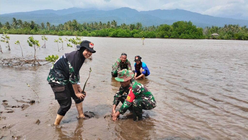 Penanaman pohon mangrove yang dipimpin langsung Perwira Seksi Teritorial Kapten Inf Agil bersama Danramil 1615-03/Sambelia Kapten Inf Zulkarnaen juga dihadiri Mahasiswa yang sedang melaksanakan KKN dan Pramuka Saka Wira Kartika binaan Kodim 1615/Lotim.