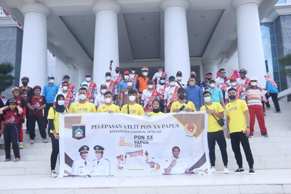 LOMBOKita – Bupati Lombok Tengah H. Lalu Pathul Bahri bersama jajaran didampingi Ketua KONI Lombok Tengah M. Samsul Qomar melepas atlet PON NTB secara simbolis di kantor bupati, Jumat (10/09/2021).