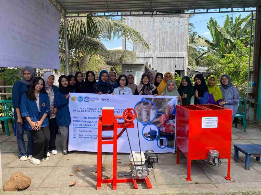LOMBOKita – Untuk meningkatkan kapasitas produksi minyak kelapa murni atau Virgin Coconut Oil (VCO) dan menjalin kemitraan usaha di Desa Lendang Nangka, Dosen Universitas Mataram telah memberikan sosialisasi dan pendampingan transfer teknologi mesin produksi serta kemitraan kepada Kelompok Wanita Tani (KWT) Al-Ummahat di Desa Lendang Nangka Kabupaten Lombok Timur.