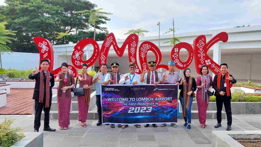 LOMBOKita – PT Angkasa Pura I Bandara Lombok bersama Dinas Perhubungan Provinsi NTB dan Dinas Pariwisata Provinsi NTB menyambut kedatangan penumpang perdana yang mendarat di Bandara Lombok, Minggu (1/1/2023) pagi.
