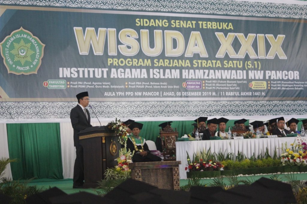 Sementara itu, Bupati Lombok Tumur, HM Sukiman Azmy juga menyampaikan Wisuda ke-29 yang digelar IAIH Pancor ini haris menjadi sarjana yang dalam istilah yang pernah disebut pendiri NW, sarjana itu adalah siroo jun lana bukan sarrun jaa ana.