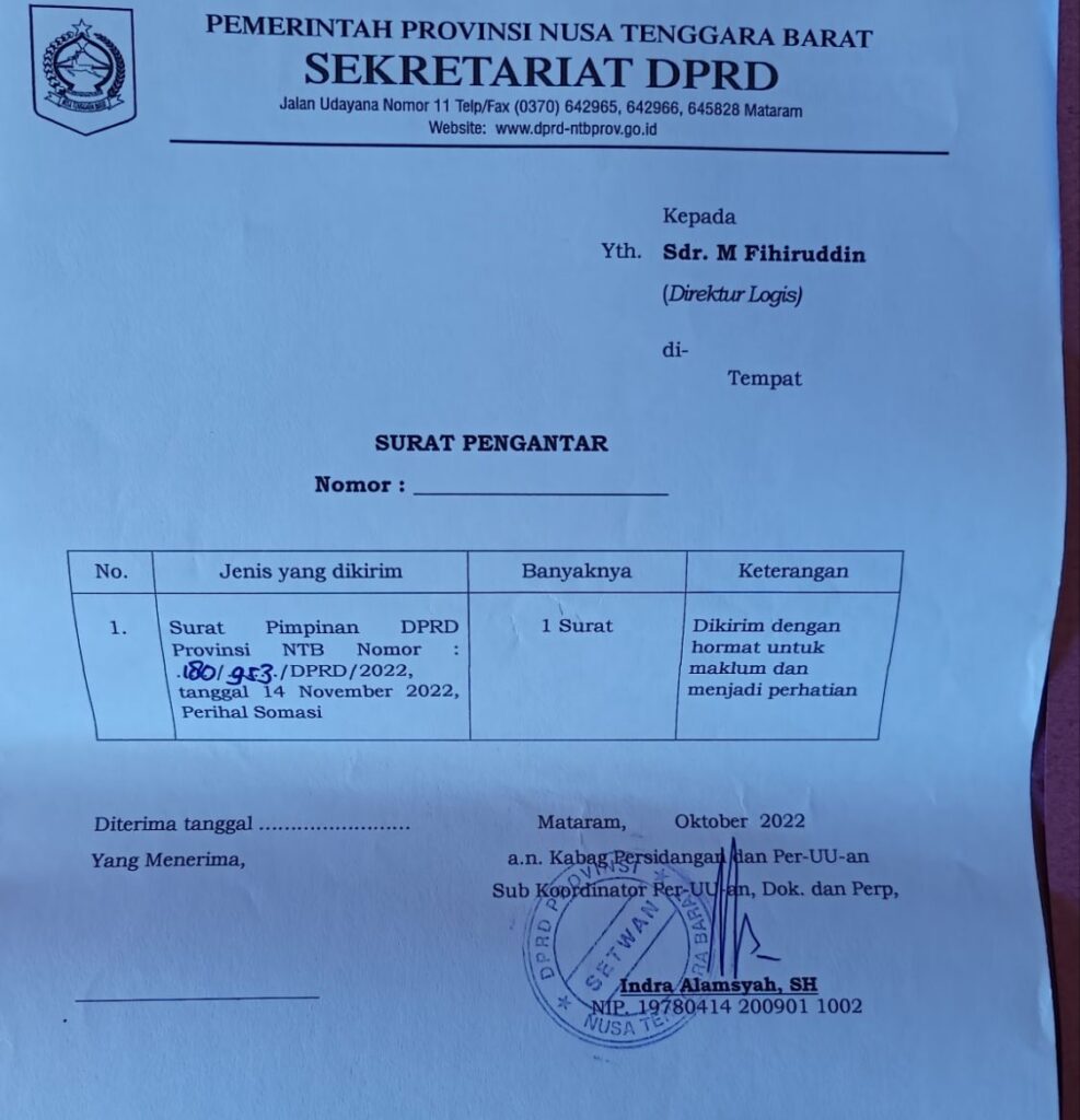 Berikut surat somasi yang dilayangkan pimpinan DPRD NTB ke Fihirudin yang juga diketahui sebagai Direktur LOGIS NTB: