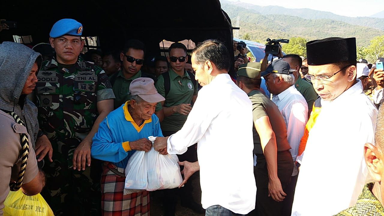 Keterangan Foto : Presiden Joko Widodo dengan didampingi Gubenur NTB, KHM.Zainul Majdi saat memberikan sembako kepada korban gempa.