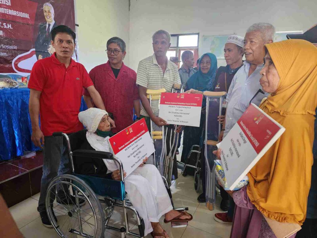 Menggandeng Sentra Paramita Mataram, salah satu unit kerja Kementerian Sosial di NTB, Selasa (6/12/2022), Rachmat membagikan belasan Alat Bantu untuk kaum difabel, seperti kursi roda elektrik, kursi roda celebral palsy, kursi roda standar, alat bantu dengar, dan tongkat ketiak.