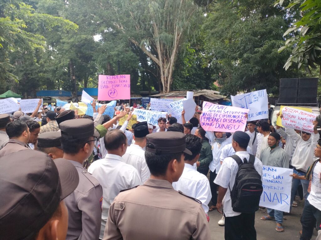 ” Kami minta Ustaz kami dibebaskan dari segala tuntutan karena tidak bersalah dan harus segera dikembalikan nama baiknya,” teriak Suharji orator aksi,dalam orasinya.