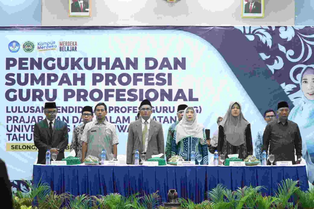 LOMBOKita – Universitas Hamzanwadi Lombok Timur mengukuhkan 446 mahasiswa program pendidikan profesi guru (PPG) Prajabatan. Dari total 446 mahasiswa yang diukuhkan, 338 di antaranya turut hadir secara langsung (luring) dalam upacara wisuda yang diselenggarakan di auditorium kampus. Sementara sisanya, sebanyak 108 mahasiswa, mengikuti prosesi wisuda secara daring melalui platform online yang disediakan oleh universitas.