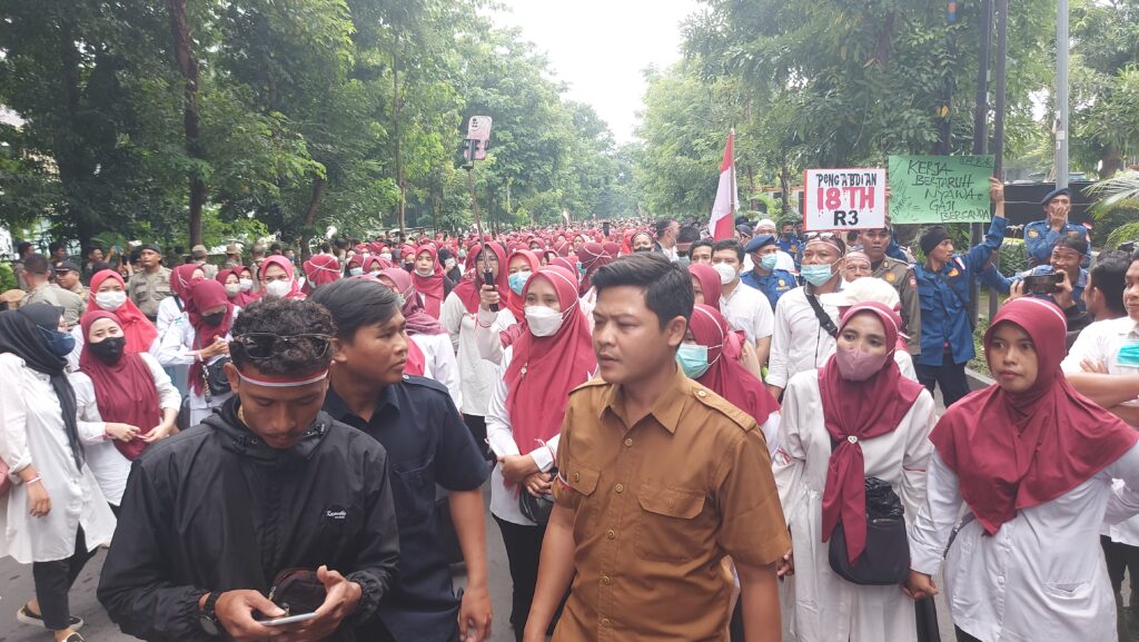 Massa aksi tenaga honda atau tenaga non ASN mendapatkan pengawalan dari aparat kepolisian, agar aksi berjalan aman dan damai.