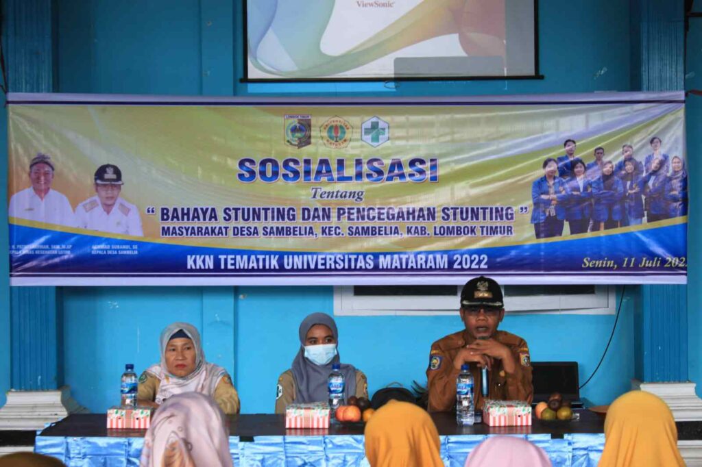 Pada hari Senin tanggal 11 Juli 2022 pukul 09.00- 12.00 WITA, Bertempat di Aula Kantor Desa Sambelia, KKN-T STUNTING UNRAM Desa Sambelia, Kecamatan Sambelia, Kabupaten Lombok Timur melaksanakan sosialisasi dengan konsep yang berbeda dari biasanya, yaitu pemberian pemahaman tentang bahaya stunting bagi anak-anak oleh pemateri dari pihak Dinas Kesehatan Lombok Timur dan Puskesmas Kecamatan Sambelia yang tentunya memiliki kapasitas yang benar-benar memilki kompetensi dalam bidang gizi dan anak.