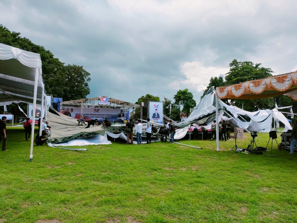 LOMBOKita – Terop tempat kampanye Tuan Guru Bajang (TGB) Zainul Majdi untuk Capres dan Cawapres Ganjar – Mahfud di Lapangan Nasional Selong, Lombok Timur, sekitar pukul 13.10 Wita. Senin (5/2/2024) sebelum pelaksanaan kampanye dimulai roboh dihajar angin puting beliung,