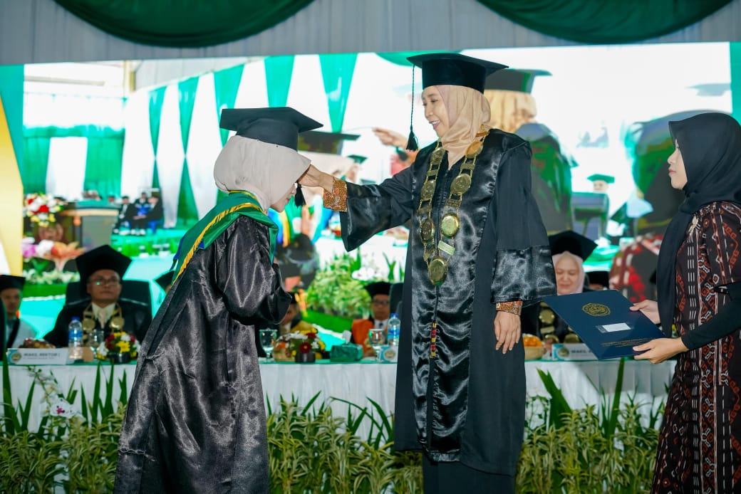 Keterangan FOTO: Rektor Universitas Hamzanwadi Pancor DR Hj Sitti Rohmi Djalilah mewisuda ribuan mahasiswa_i, Sabtu